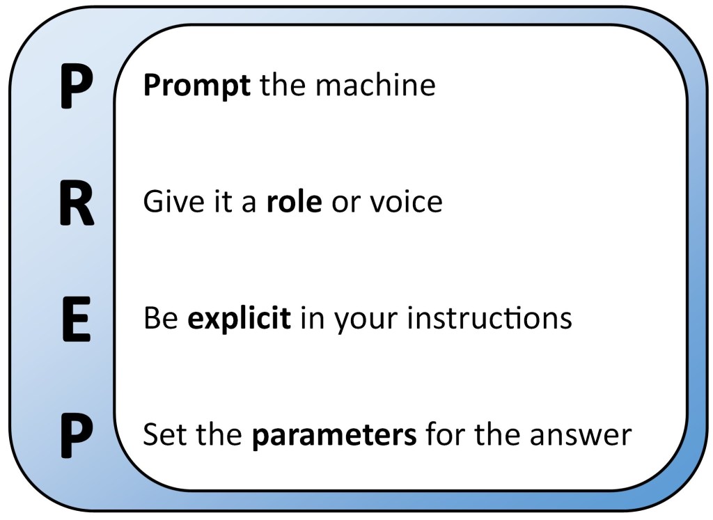PREP is an acronym for a structured way to address any of the large language models. It helps ensure that you have covered all the bases before asking for a result. The nice thing is that, if, like me, you store all the PREP you have ever written in a Word document, you do not need to rewrite it every time!