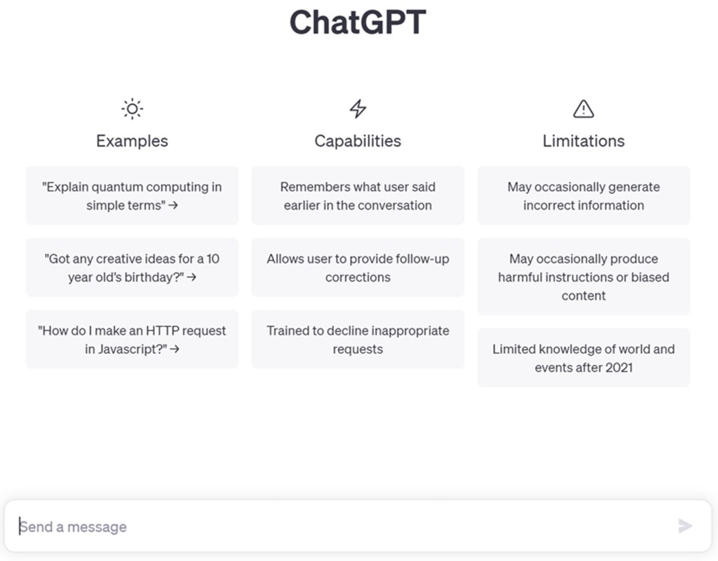 You can instantly start typing in the “Send a message” box and ChatGPT will return results. It is worthwhile playing around a bit at this stage to get a feel for the system.