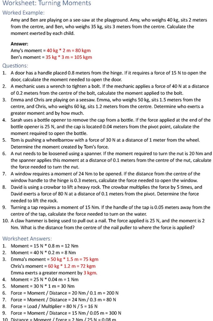 - Explicit: The sheet should be on turning moments, the equation moment = force * distance, and its rearrangements
