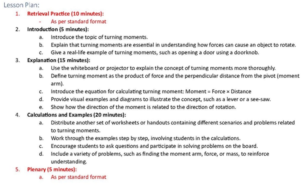 First thoughts: Overall, the worksheet has a lot of usable content. After the teacher has corrected the errors, this could be distributed to the class for use and they should improve their understanding of the equation for moments by completing it. Having said that, the questions are very “samey” which may lead to boredom in a more able class (but it absolutely does suit a less able class). I write this from experience of having asked my pupils for feedback on AI-generated content in the past: It tends to be usable but boring at the top end.
